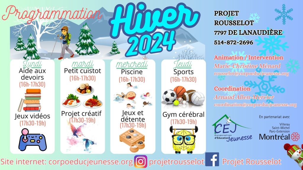 Le Projet Rousselot est en activité depuis 1995, d’abord au sein de l’organisme Créations Etc…. Depuis mars 2020, le Projet entreprend une transition vers l’organisme La Corporation d’Éducation Jeunesse, qui intervient aussi auprès des jeunes du secteur de l’est de Villeray. Depuis ses débuts, le projet compte parmi ses collaborateurs le CLSC Villeray, la Ville de Montréal et l’Office municipal d’habitation de Montréal pour réaliser sa mission. Le Projet offre aux jeunes âgés de 5 à 17 ans du Complexe d’habitation Rousselot et de la communauté environnante, des programmations d’activités éducatives, culturelles, sportives, communautaires stimulantes et enrichissantes favorisant le développement intégral des jeunes. Des périodes d’aide aux devoirs et de mentorat sont aussi offertes afin de participer à la réussite scolaire des jeunes et d’éveiller le goût pour les études. Le Projet Rousselot tient également un camp de jour estival et à la semaine de relâche.